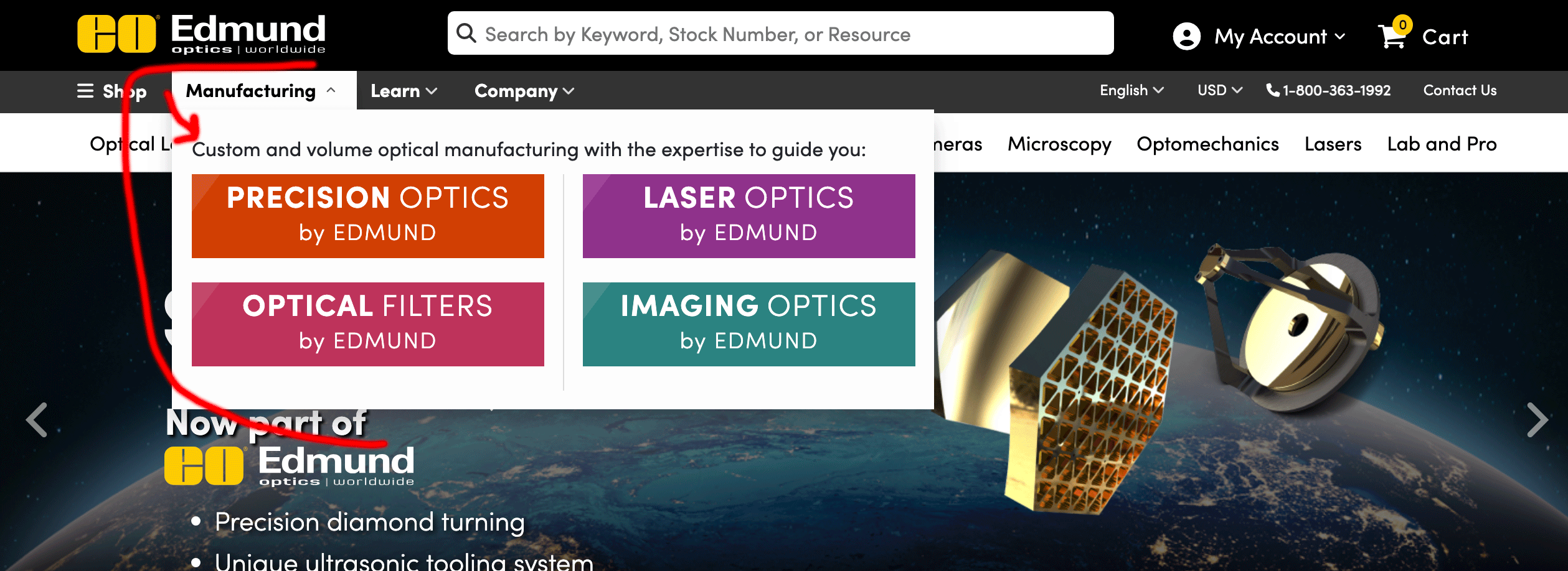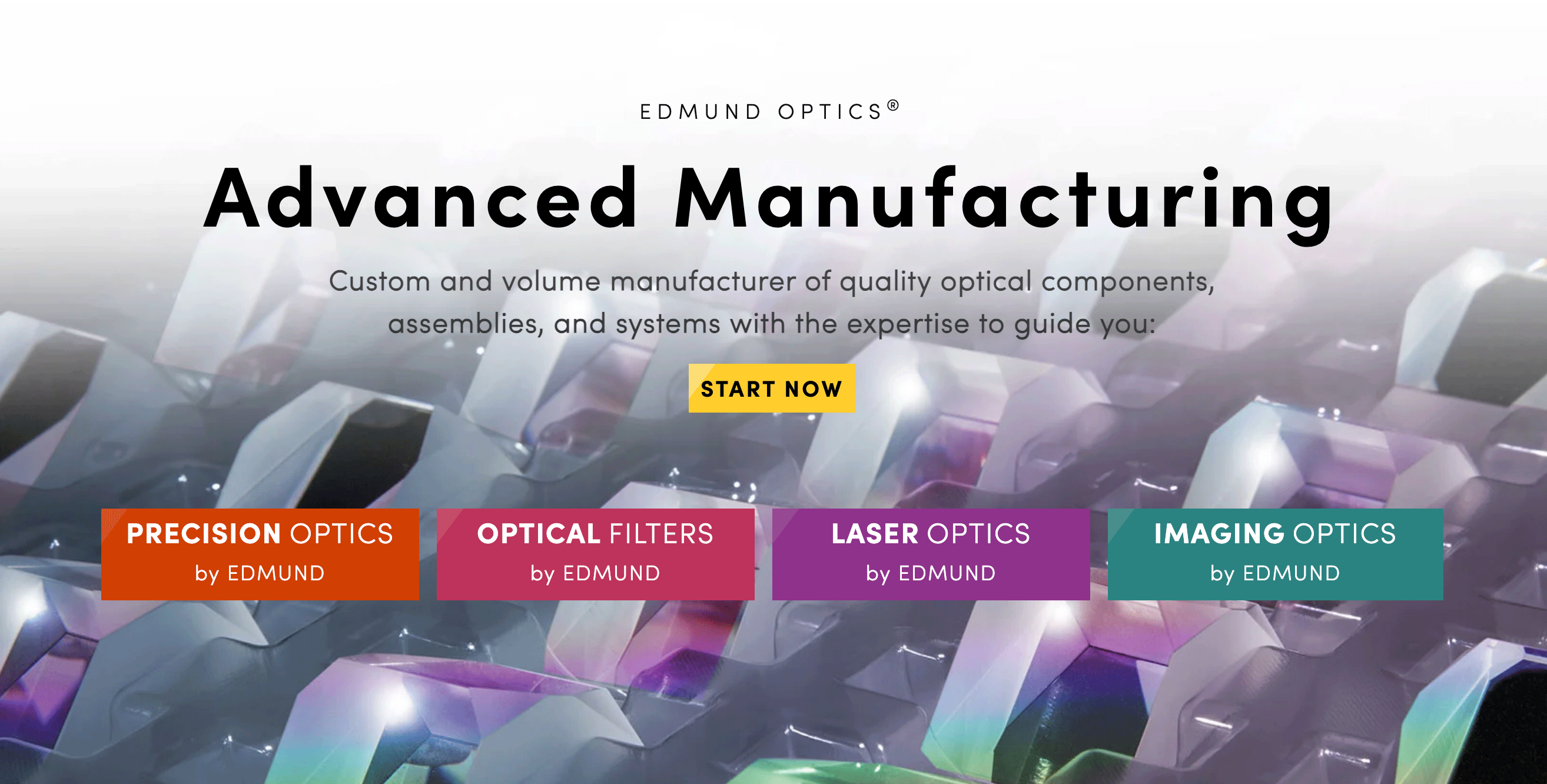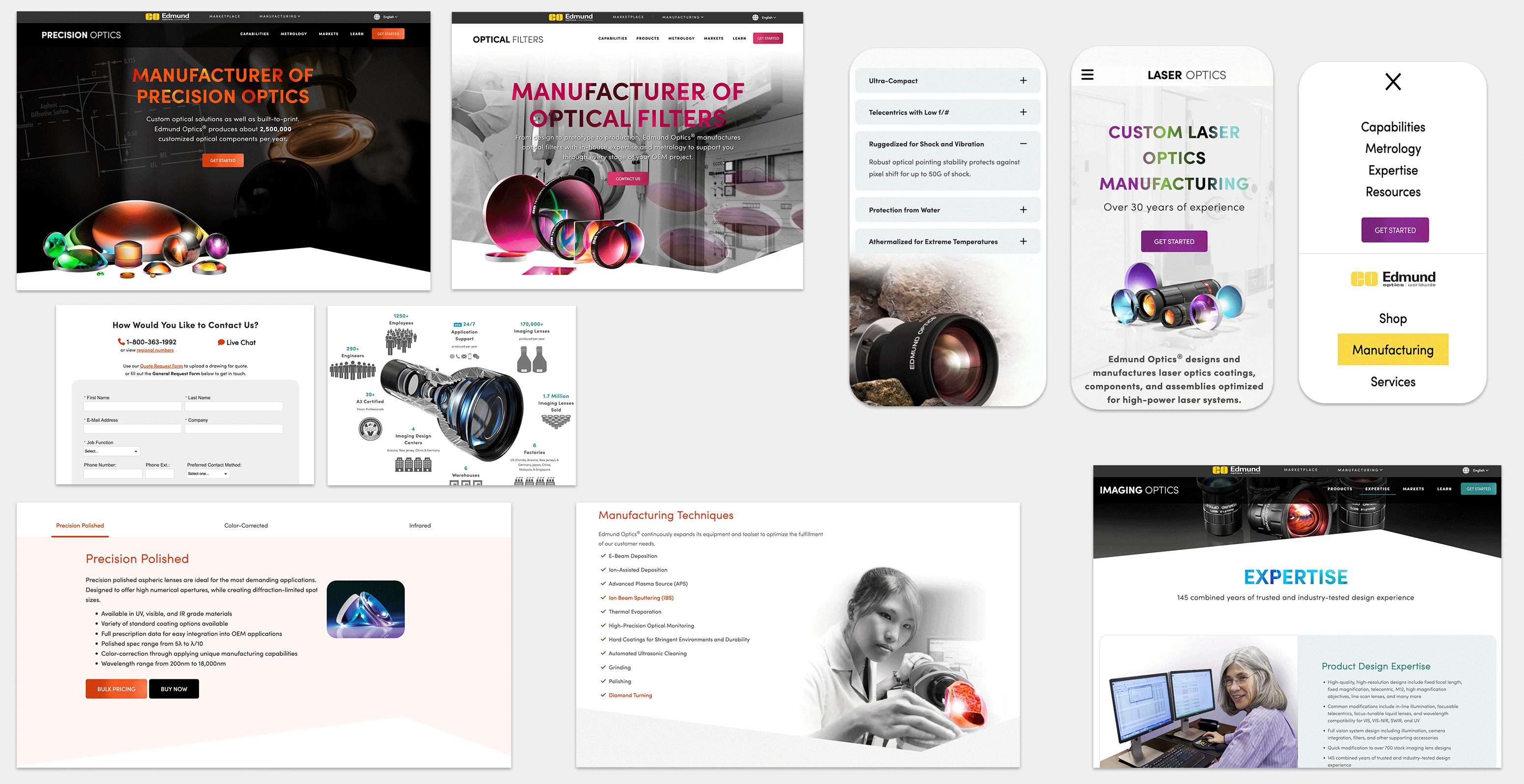 The goal was to create individual manufacturing websites with the primary purpose of attracting high-volume customers based on the key product types of Precision Optics, Optical Filters, Imaging Optics, and Laser Optics. Pricing for custom orders or bulk purchases was customized on a per-customer basis. Therefore, it was crucial to differentiate between the e-commerce (low-volume) site and the manufacturing-focused sites. The sales team needed materials and credibility throughout the website to showcase their capabilities.There was also a tight deadline to launch all four sites within a two-month time frame.